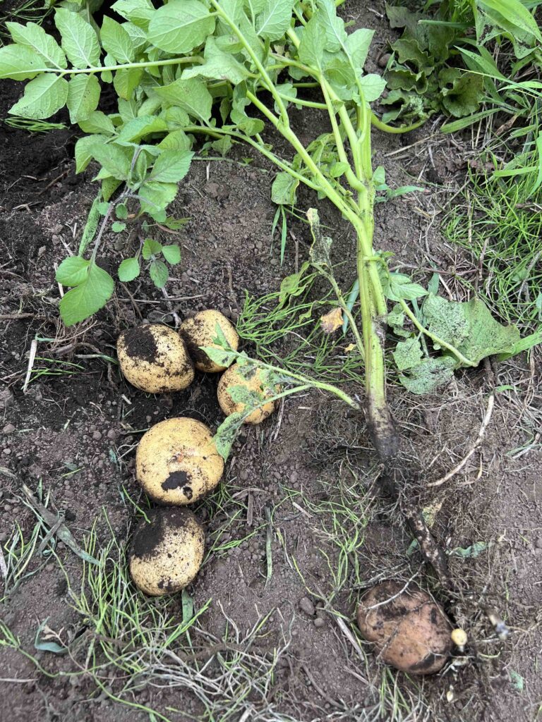 巷で人気の栗芋系元祖「インカの目覚め」の問題点は収量がとれないこと。これを改善したのがこの長崎黄金です。春先から生育は順調だったので期待しながら、いざ試し堀り!(じゃがいもはここが一番緊張します。)一株につき4~5個程度。採れる品種と比べると半分くらい。しかし一つ一つのサイズはいい感じのものが多く収穫量としては60点上げましょう!